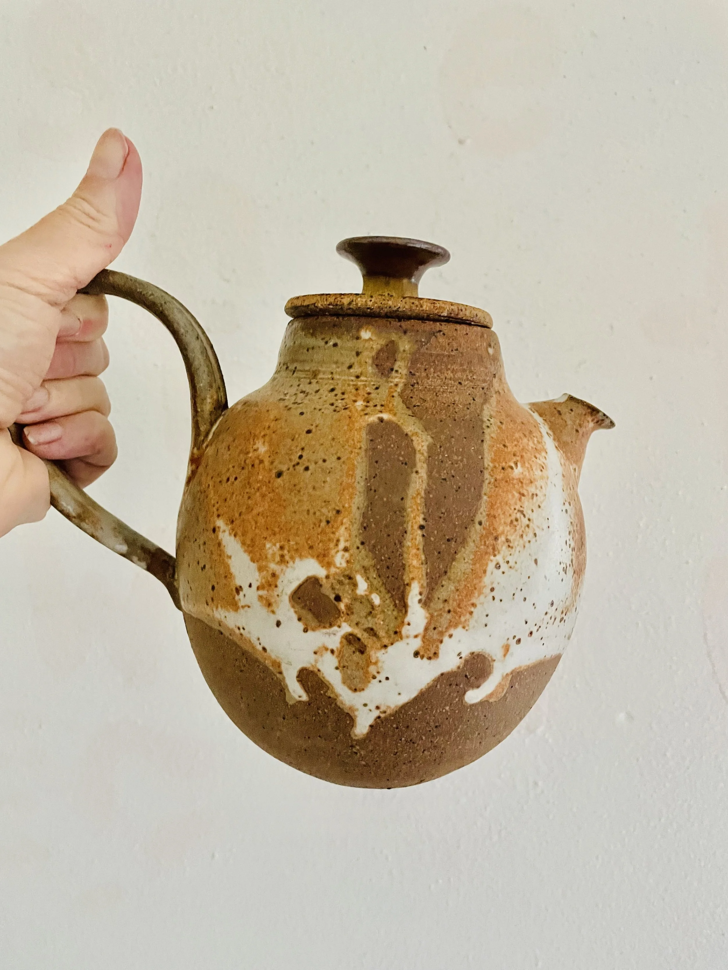 Gorgeous signed studio pottery teapot. Fabulous exaggerated handle and small spout. Colors are a drip glaze and beautiful!